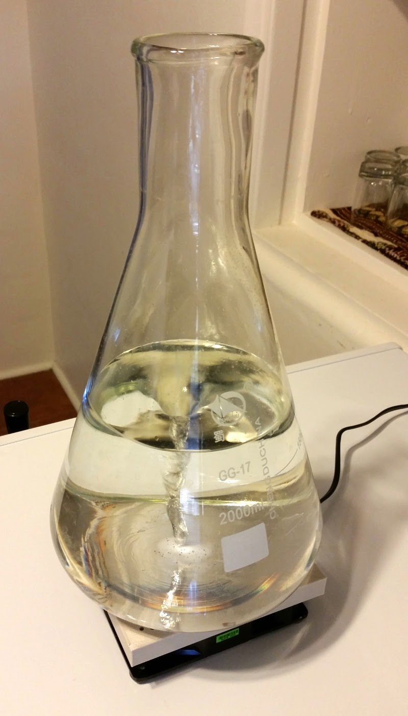 All told, it cost about $40 in materials to put this together. I assembled the stir plate this weekend, and ran a test with about 1.5 L of water in my 2 L flask. The setup works pretty well, and I’ll be putting it into use for my next batch.