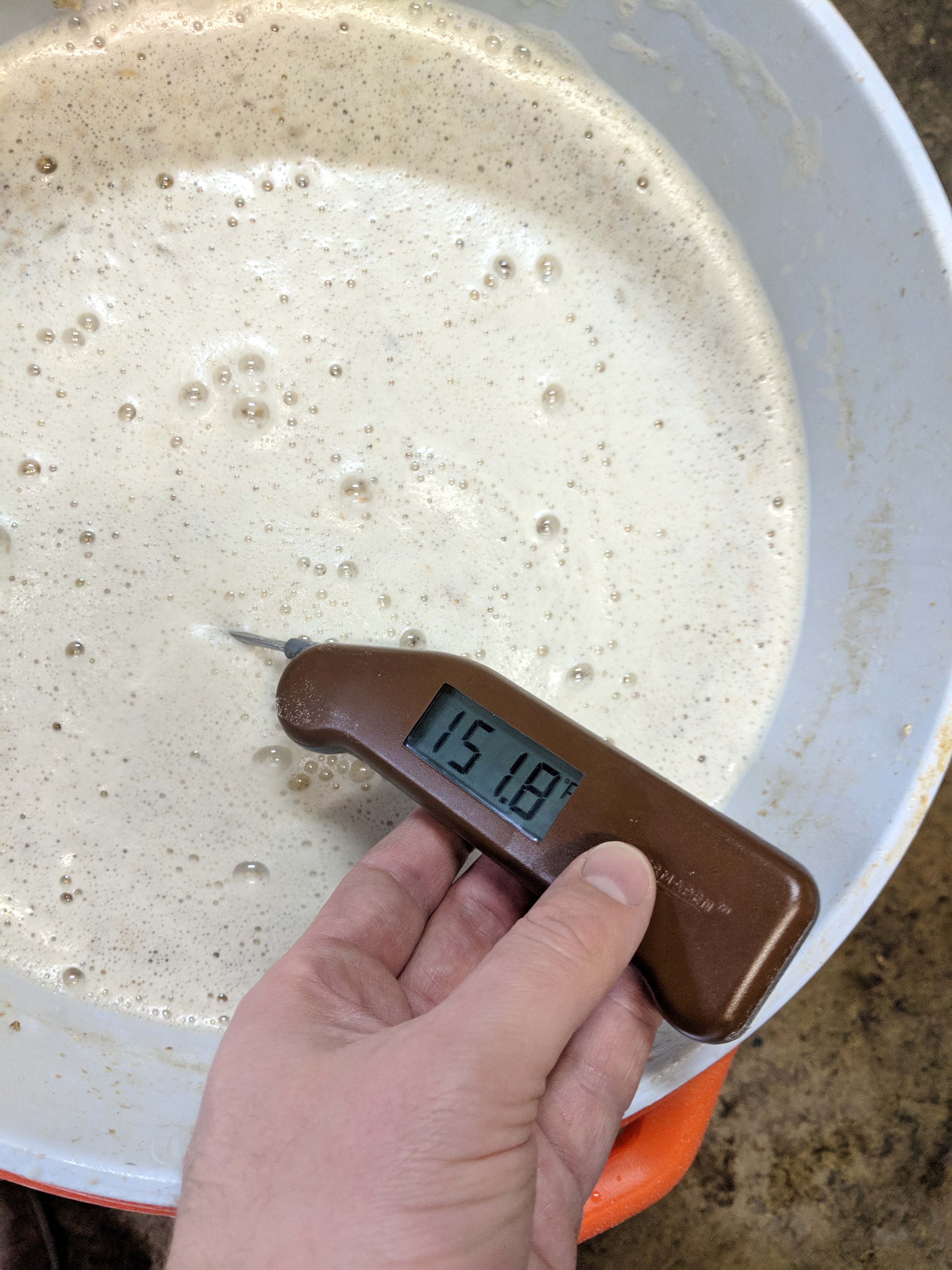 - I mashed in with 3.25 gallons of water at 165°, to hit a 154° mash temperature. I let this sit for 60 minutes, and it was down to 151° by the end. I added 0.3 gallons of water at 185°, let sit for 10 minutes, vorlaufed, and collected first runnings.
