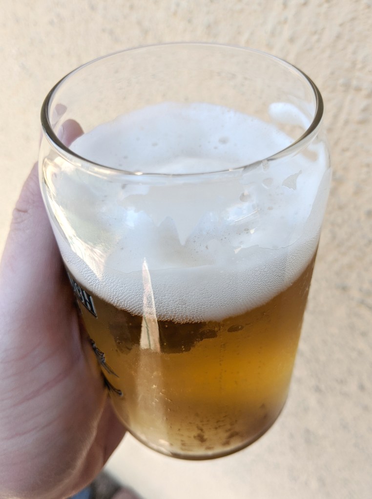 - Light gold color, slight haze, creamy and persistent white head. The haze had dropped out, but when I moved the keg between houses, it must have kicked up a bunch of sediment, because even after a week it was still hazier than two weeks prior. Very annoying! The head is gorgeous, so that makes up a little bit for the haze. After another month of settling, the beer was back to its crystal clear original nature.