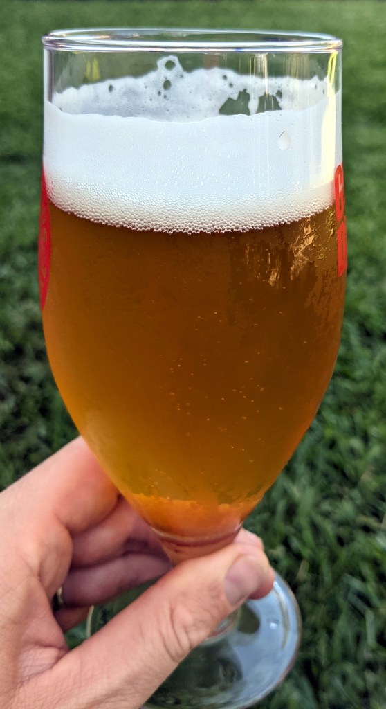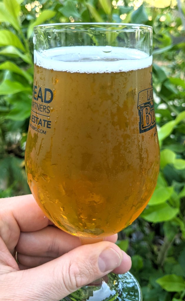 - Pours as a golden, somewhat hazy beer, with a creamy white head that is very persistent. The head leaves gorgeous lacing down the sides of the glass.