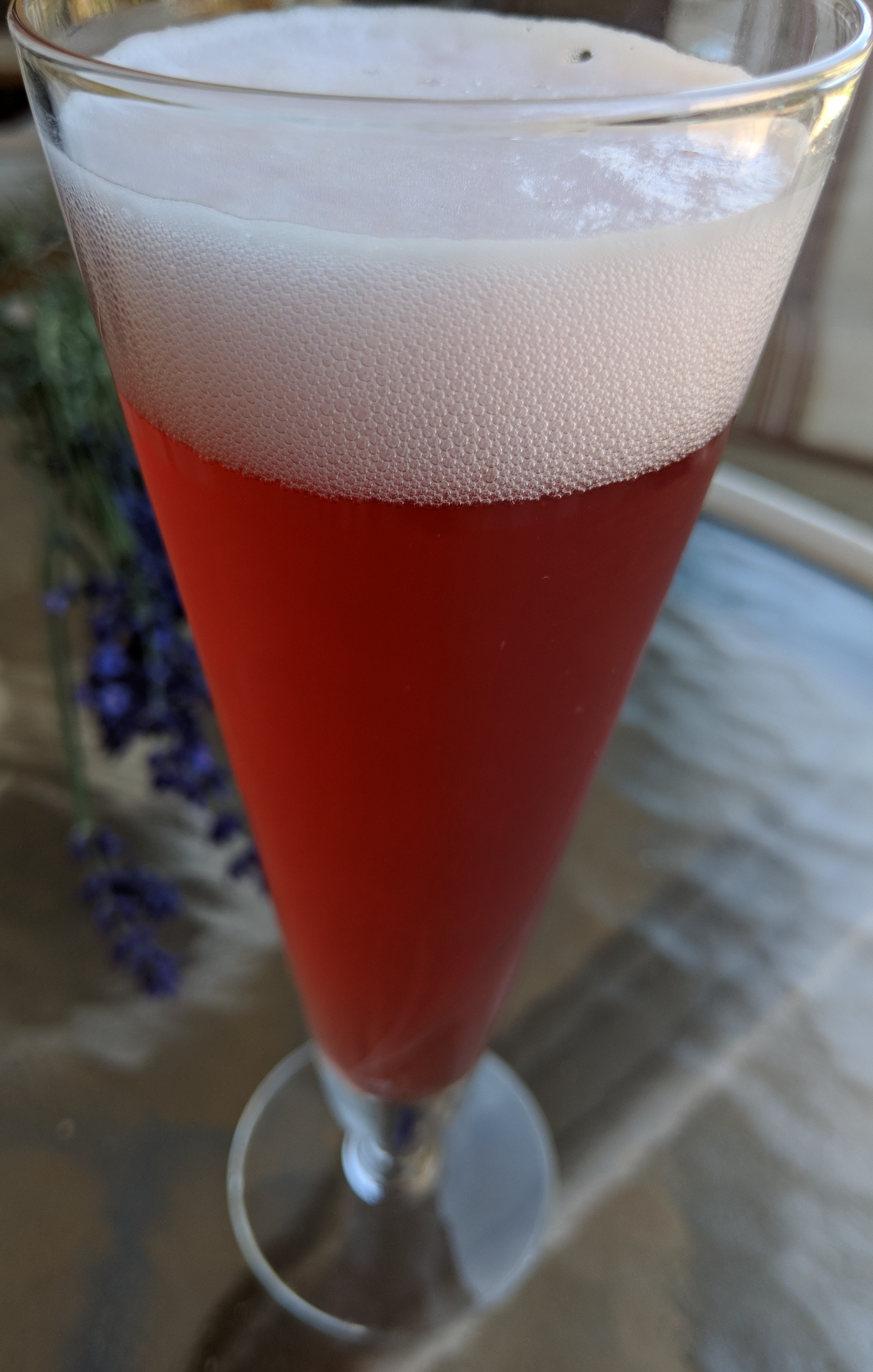 • The beer is gorgeous! I pours with a pink, frothy, and somewhat persistent head. The beer itself is dark pink, and moderately (but not overly) hazy. I think it’s looking clearer than might be usual, because I’m using a floating dip tube. I wouldn’t mind a little extra haze, if it helped augment the mouthfeel and flavor.